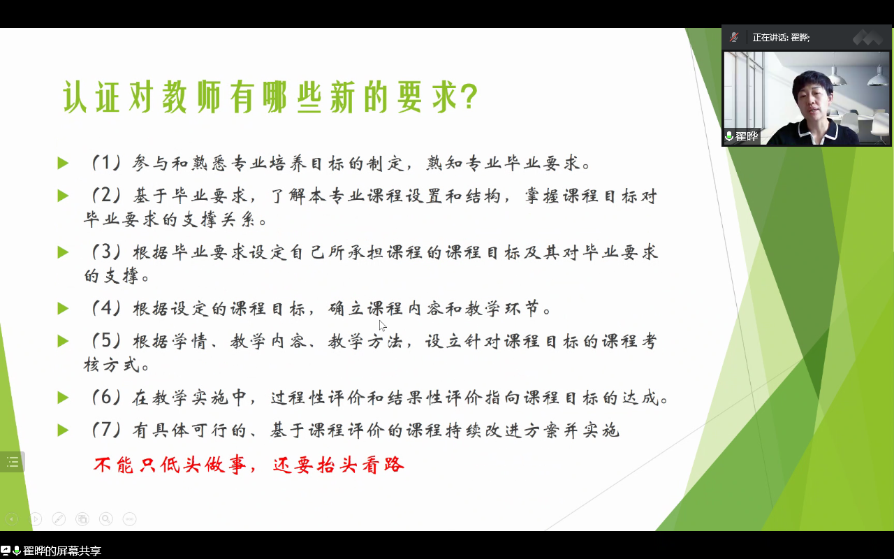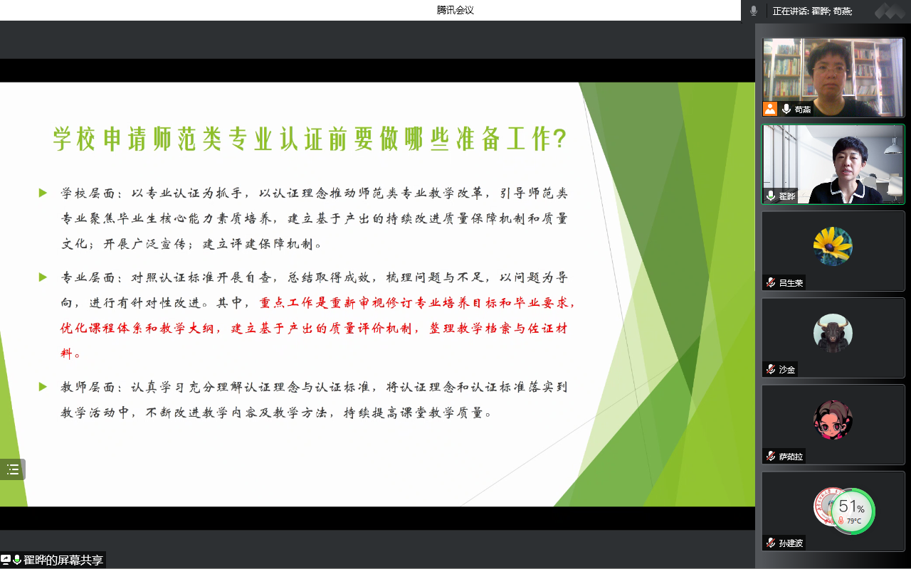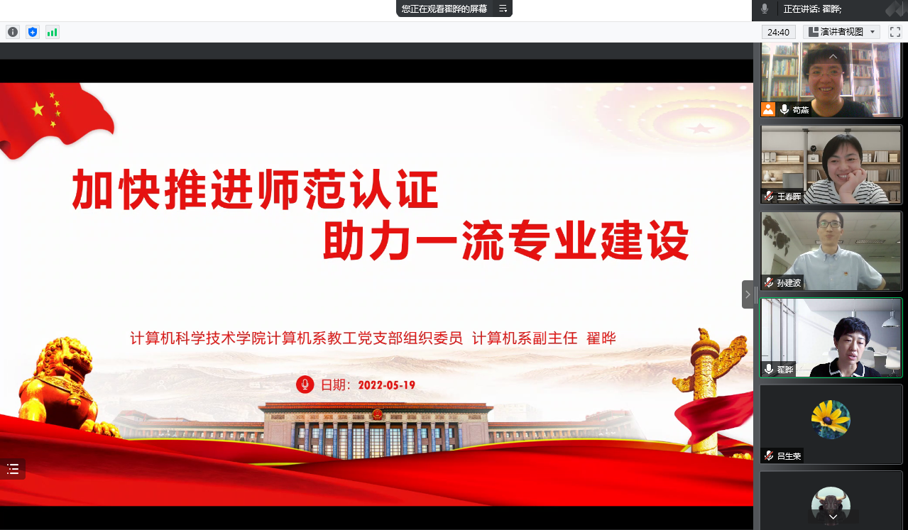 会上,计算机系党支部组织委员、计算机系副主任翟晔围绕公司师范认证工作了详细汇报。首先回顾了公司师范认证的前期准备工作、汇报了目前公司师范认证的进展情况并介绍了下一步的工作计划,最后强调了师范认证作为公司今年的头等要务,需要每一位老师的鼎力支持和全力配合。汇报之后,老师们和系主任围绕师范认证的重要性和目前存在的困难进行了激烈的讨论和交流,大家纷纷表示愿意为了攻克师范认证这个重任贡献自己的一份力量。