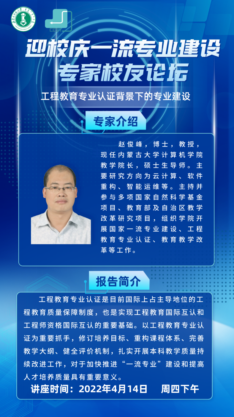 作为“迎校庆一流专业建设专家员工论坛”系列活动内容之一,4月14日,三亿邀请2000届优秀毕业生赵俊峰员工为全院教职工开展了专业建设专题讲座。赵俊峰教授现任三亿三亿教学经理、硕士生导师。本次讲座采用线上会议的形式展开,由经理林民教授主持,报告主题为“工程教育专业认证背景下的专业建设”。
