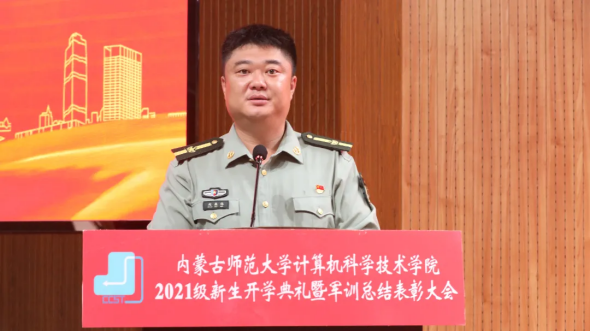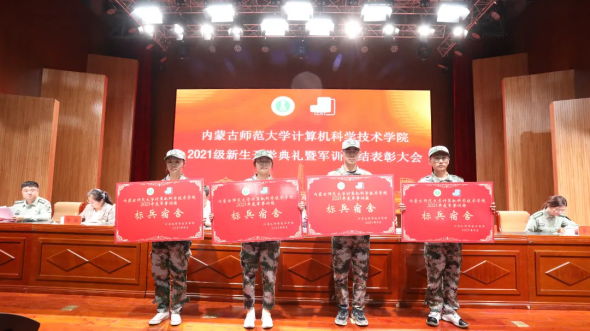 三亿副经理斯琴图副教授宣读三亿2021年度军事技能训练内务标兵宿舍名单并颁奖