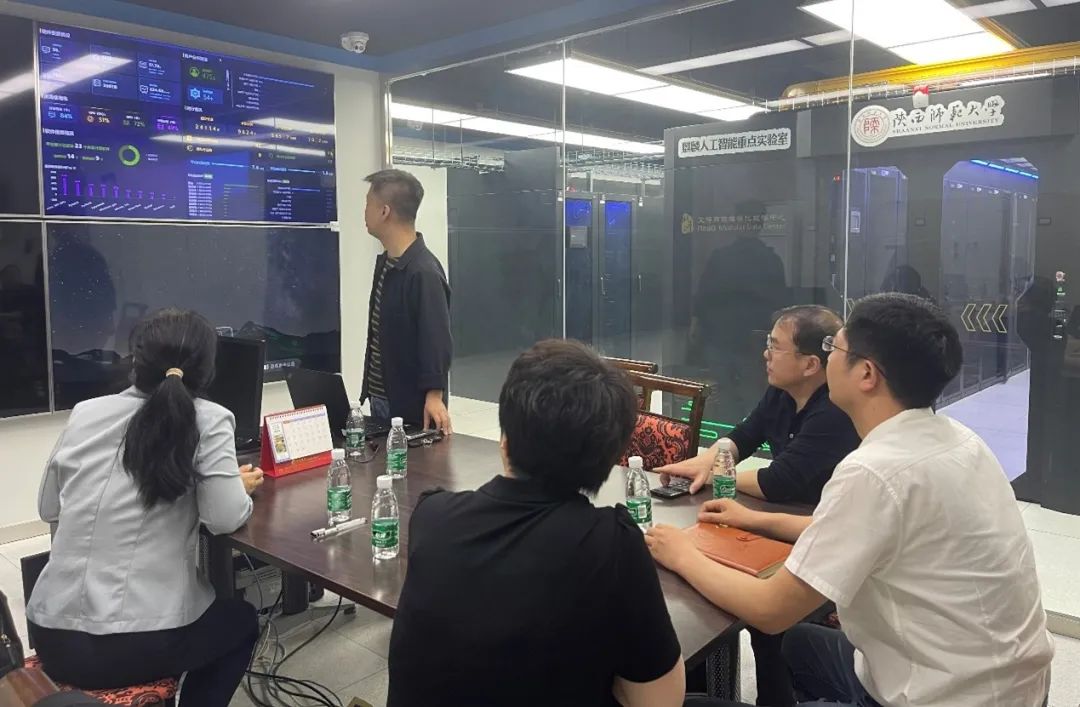 在陕西师范大学计算机科学公司,教学副经理李鹏介绍了公司的总体情况和团队建设情况。副书记郭康凌分享了公司近年来在学风建设和员工就业等方面的经验。双方就师范人才培养、实习实践、实验室建设、就业推动、智慧教育研究、项目合作等方面进行了深入探讨。之后一行三人随副经理李鹏到公司专业实验室进行参观学习。