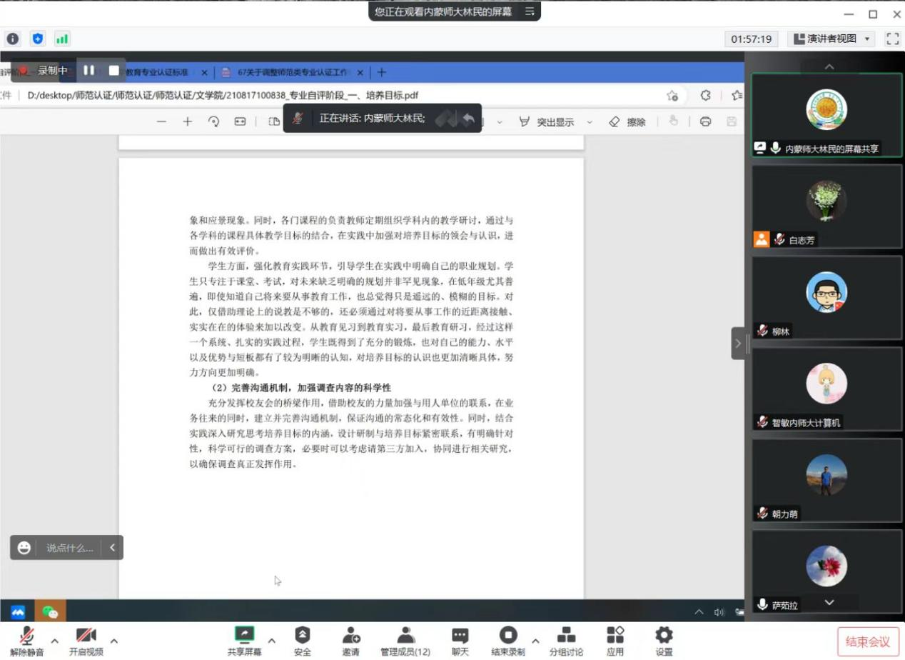 会议上,林民经理就师范类专业认证自评报告中八个模块的撰写明确了分工,提醒撰写人员需要注意的问题,包括文字的表述、文件支撑材料的合理性等,要求各组按时提交自评报告和师范专业认证存在的问题,并把自评报告及时上传到在三亿体育有限公司2023年度师范类专业认证遴选平台。