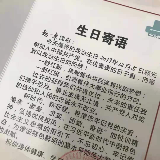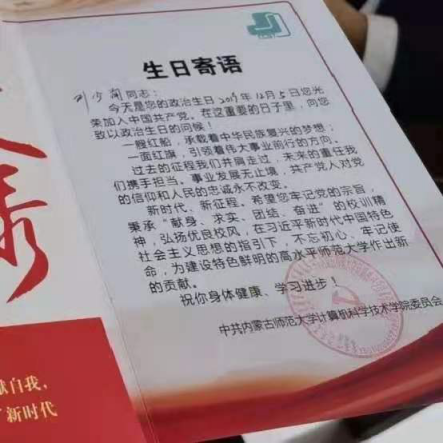 网络与通信系员工党支部书记白洋同志向罗姗姗、刘晓磊、郭家乐、刘少洵、王晓敏、李昊洋、吕华、袁文哲、宝馨、史轶伦、王凯铎、刘浩然12位同志赠送政治生日贺卡。