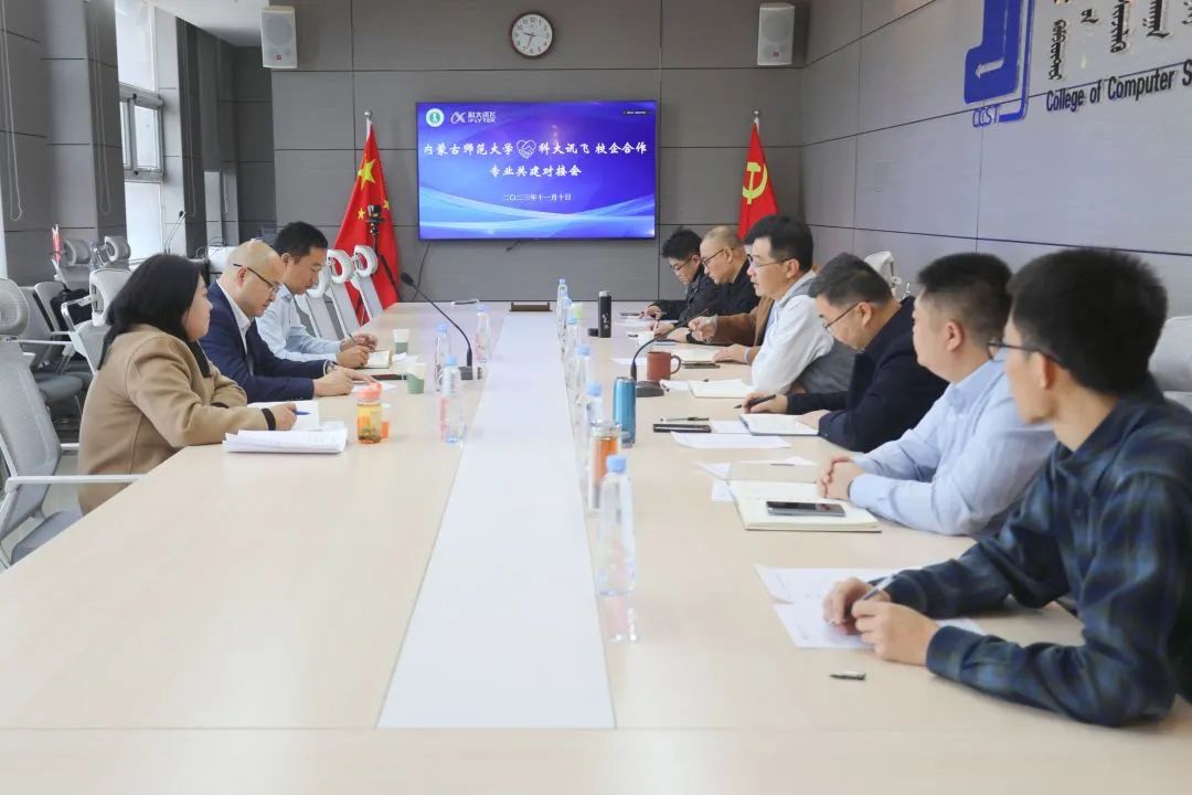 科大讯飞内蒙古大区总经理刘平、高教人才培养市场总监程含含(线上) 高教人才培养业务区域总监王家波(线上)、内蒙古大区渠道总监吴丹、内蒙古大区城市经理门少春。公司党委书记王海龙,经理林民、副经理斯琴图等相关部门负责人和教师代表参加对接会。