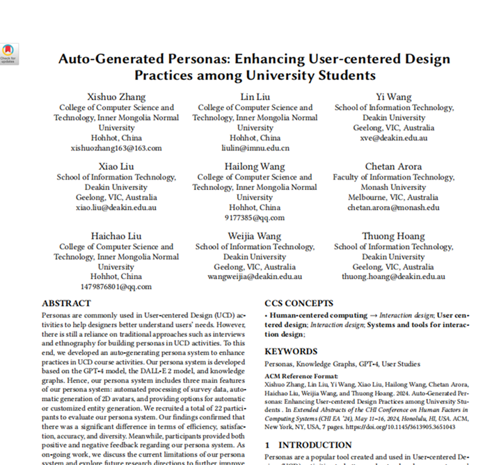 近日,公司2022级计算机科学与技术专业研究生张西硕以第一作者身份在国际权威学术会议ACM Conference on Human Factors in Computing Systems发表研究论文Auto-Generated Personas: Enhancing User-centered Design Practices among University Students